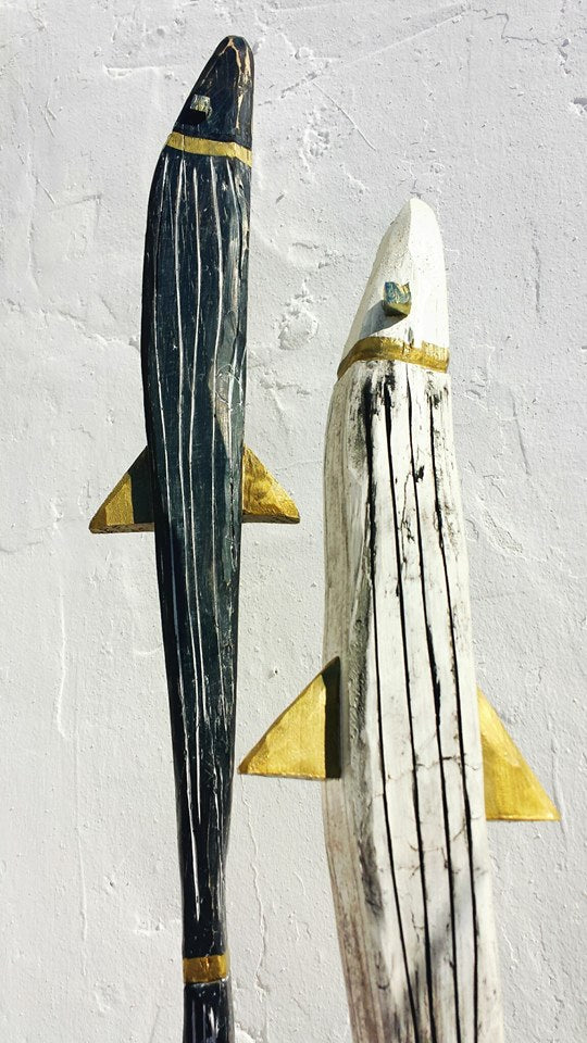 Couple of wooden Fishes. Black and white / Iron Pyrite stone eyes. (160x13cm)