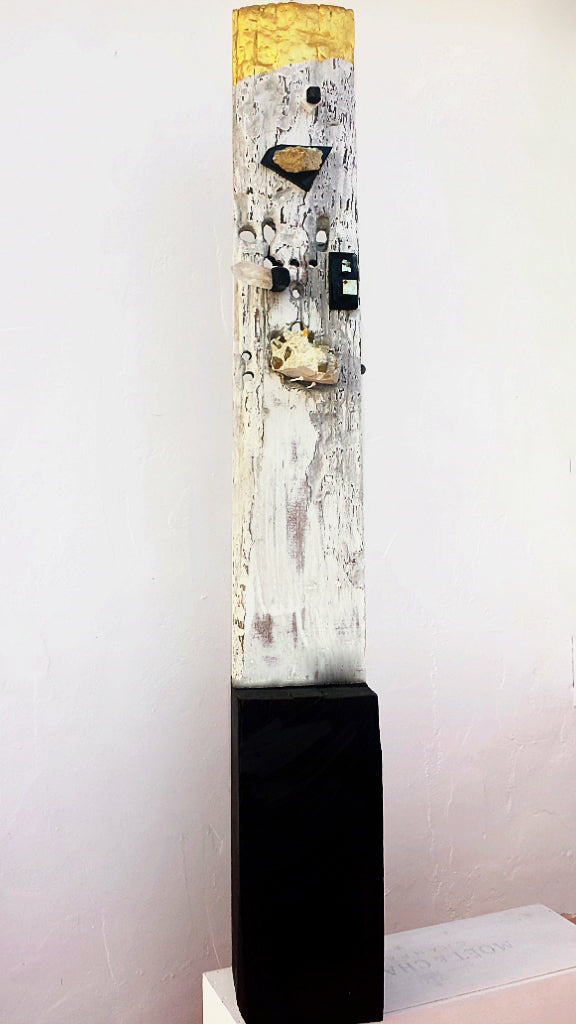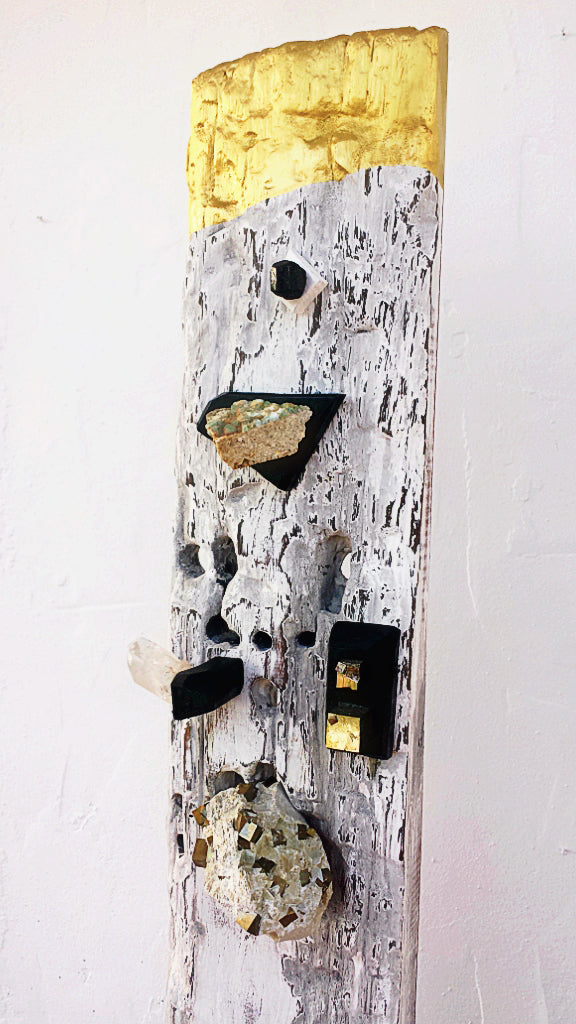 Ibiza olive wood with stones (iron pyrite, quartz, green fluorite) and golden top.